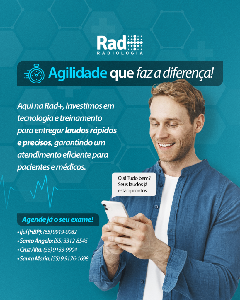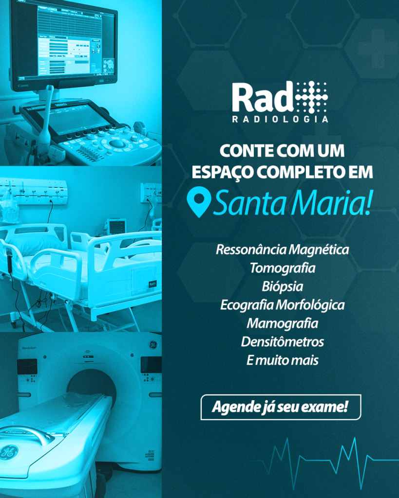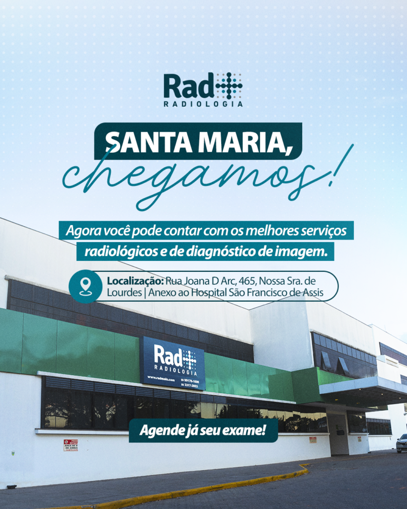 Santa Maria agora conta com uma novidade incrível! A Rad+ Radiologia chegou para transformar o cuidado com a sua saúde. Nossa nova unidade está equipada com o que há de melhor de tecnologia para garantir diagnósticos precisos e ágeis para você. Além disso, temos um espaço exclusivo para as mulheres, garantindo conforto e privacidade para exames essenciais, como mamografia e ultrassonografia. Estamos localizados na Rua Joana D’Arc, 465, Nossa Sra. de Lourdes, anexo ao Hospital São Francisco de Assis. Agende seu exame agora mesmo e cuide da sua saúde na Rad+ Santa Maria!